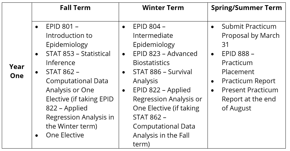 The table below illustrates the typical course and milestone sequence for a full-time MSc Biostatistics student: